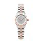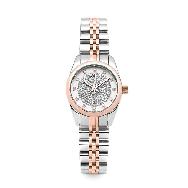 Questo orologio è interamente bicolore e ha una cassa di 28 mm su cinturino in acciaio. Il tutto impreziosito da zirconi.