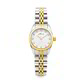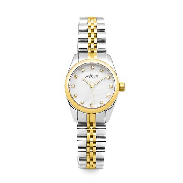 Questo orologio è interamente bicolore e ha una cassa di 28 mm su cinturino in acciaio. Il tutto impreziosito da zirconi.