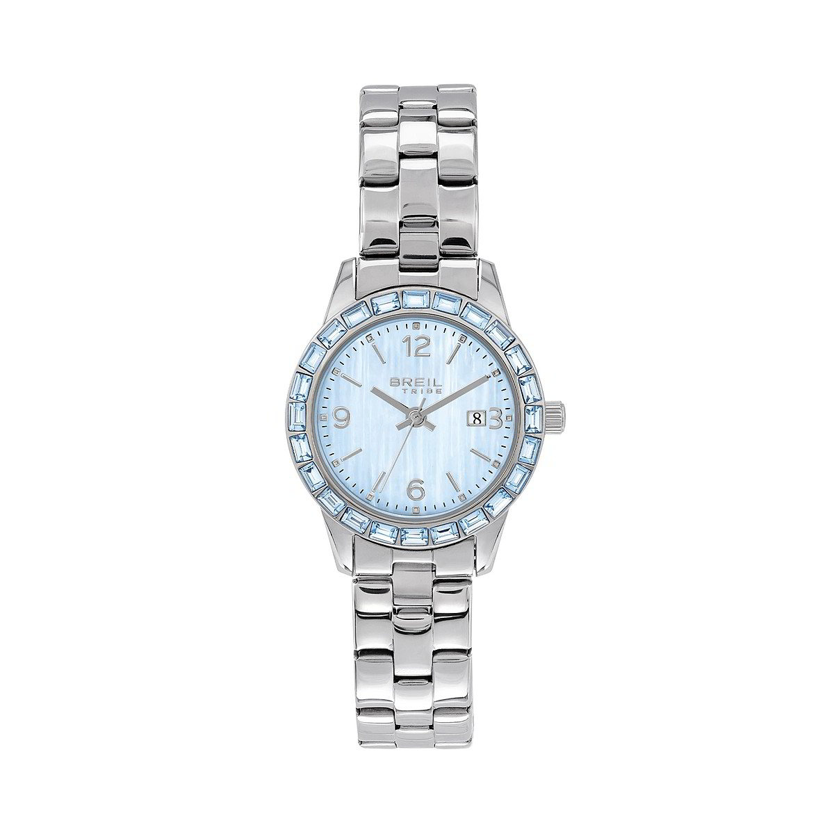 Un modello con quadrante di colore celeste. Cassa di acciaio di 30 mm e cinturino in acciaio.