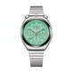 Ha il fondello serrato a vite per una resistenza di 5 atm. Cinturino in acciaio con quadrante verde e bottoni ore 12.