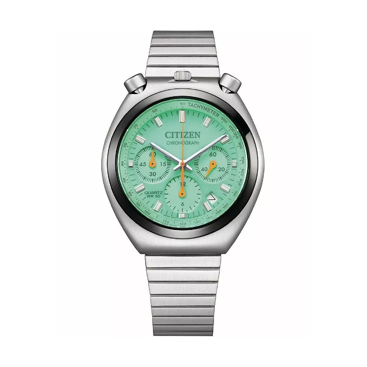 Con movimento al quarzo e funzione di cronografo. Cassa in acciaio di 38 mm con datario ore 4.