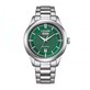 Ha il fondello serrato a vite per una resistenza di 10 atm. Cinturino in acciaio, con quadrante verde.