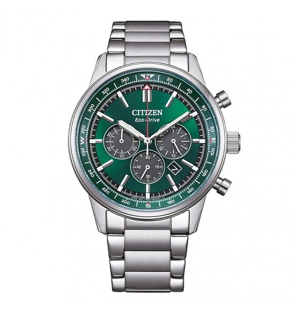 Con movimento eco-drive. Cassa in acciaio di 42 mm con funzione di cronografo.