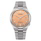 Una cassa di 40 mm in acciaio con cinturino in acciaio e dial di colore arancione.