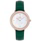 Un modello davvero elegante per la forma e il suo design, con cassa rosè da 32 mm e cinturino in pelle verde.