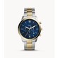 Orologio Uomo Fossil Cronografo Neutra - FS5706 Con movimento al quarzo. Funzione di cronografo. La cassa è in acciaio del diametro di 44 mm. Il cinturino è in acciaio di colore oro e argento. Il quadrante è di colore blu con datario ore 4 con indici e lancette color oro. La distanza delle anse è di 22 mm e la resistenza all'acqua di 5 atm.