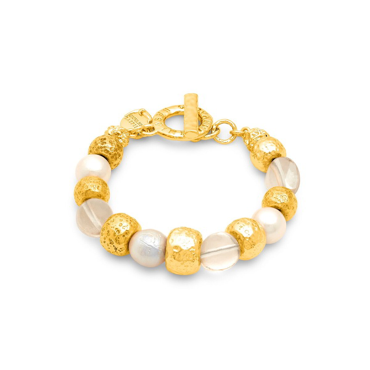 Realizzato in Bronzo bagnato nell'oro con perle e cristallo di rocca, con una lunghezza di 21 cm e chiusura T Bar.