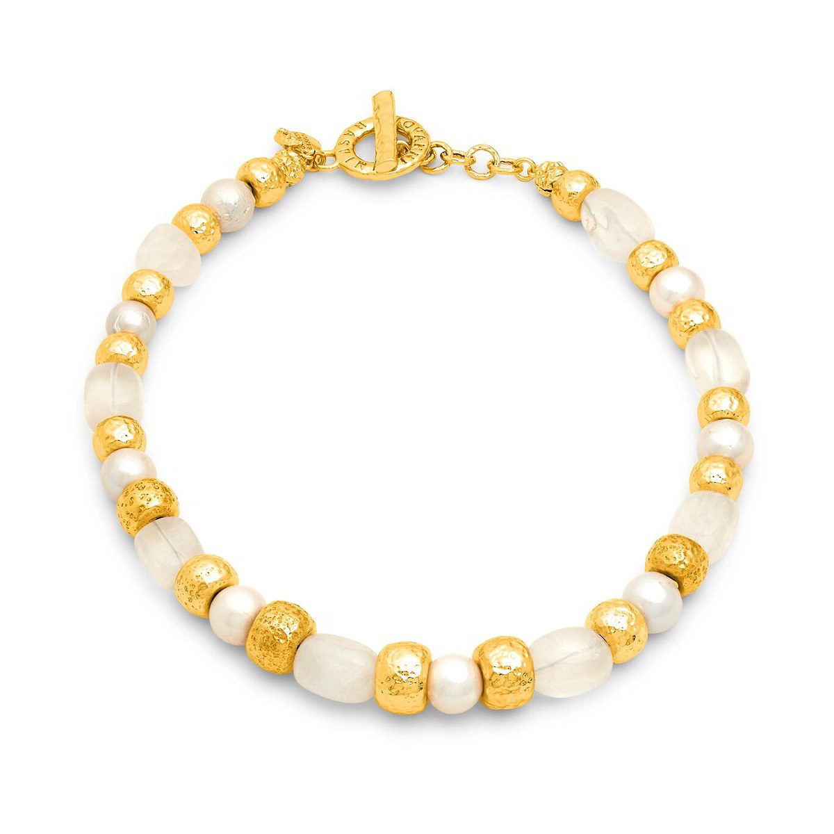 Realizzata in Bronzo bagnato nell'oro con perle e cristallo di rocca, con una lunghezza di 48 cm e chiusura T Bar.