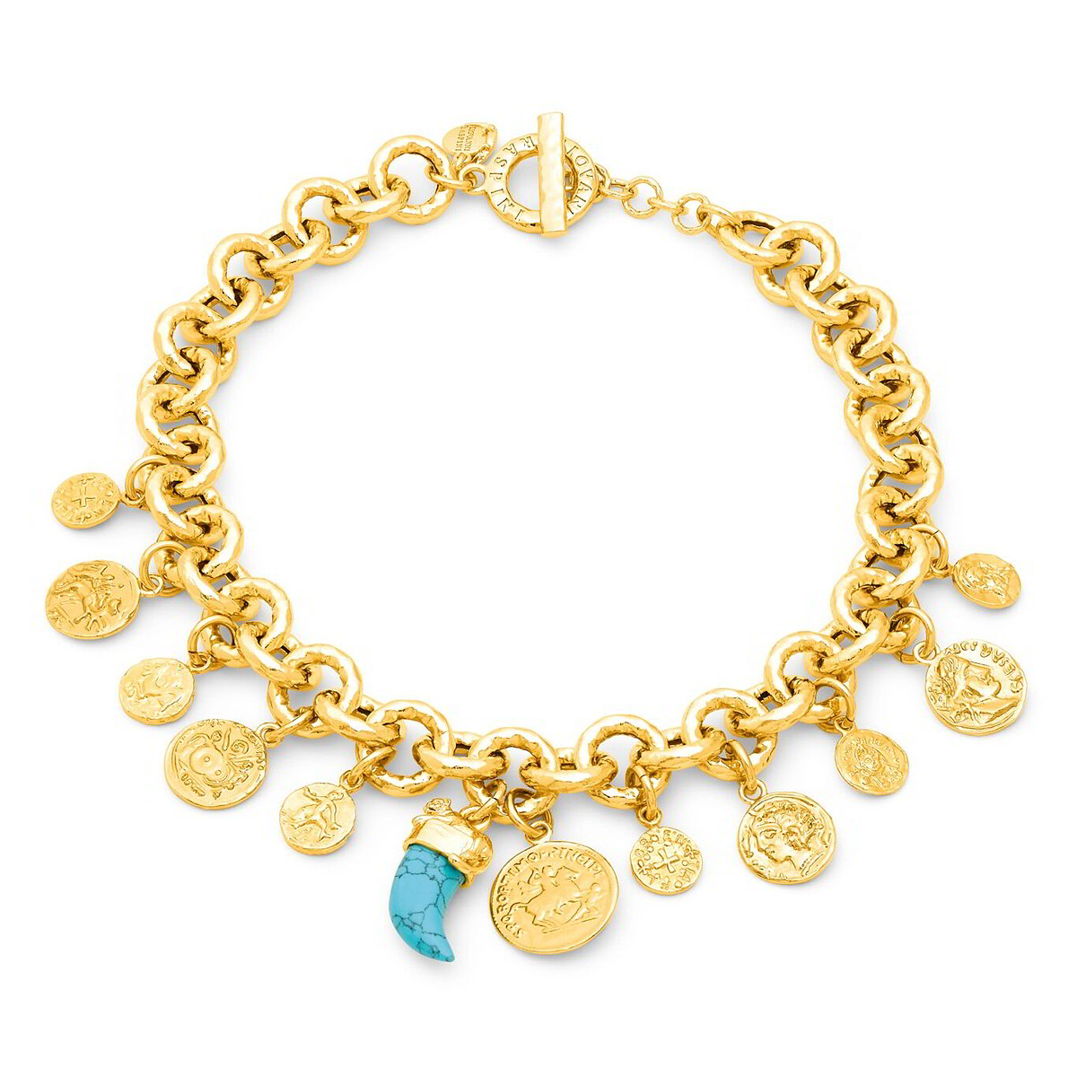 Realizzata in Bronzo bagnato nell'oro e turchese, con una lunghezza di 47 cm e chiusura T Bar.