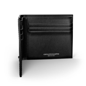 Portafoglio delle dimensioni di 13,5 x 1,9 cm con diversi scomparti per carte, banconote e monete.