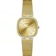 Un solo tempo con dial dorato e dettagli cristallo, con cassa da 32 mm e cinturino in acciaio.