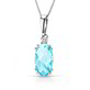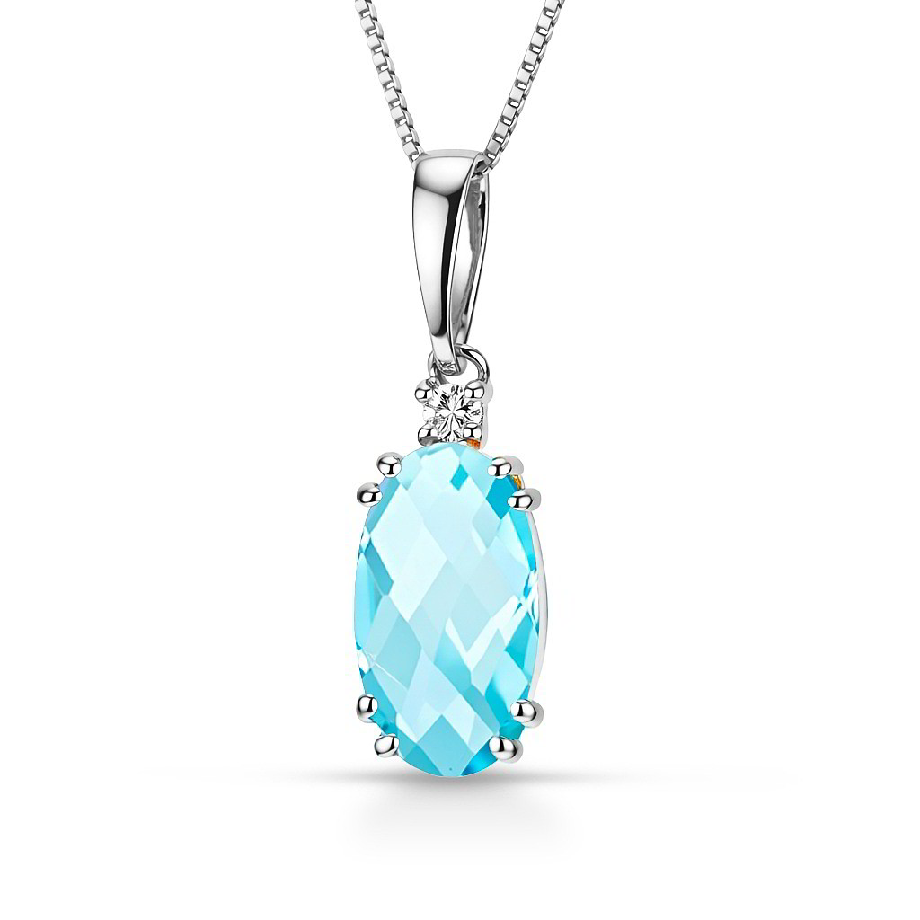 Realizzata in oro bianco 9kt, impreziosita da diamanti naturali di caratura 0.015 colore G e purezza SI, incastonato un quarzo azzurro ovale.