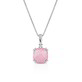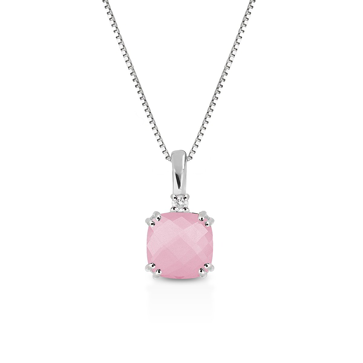 Realizzata in oro bianco 9kt, impreziosita da diamanti naturali di caratura 0.015 colore G e purezza SI, incastonato un quarzo rosa quadrato.