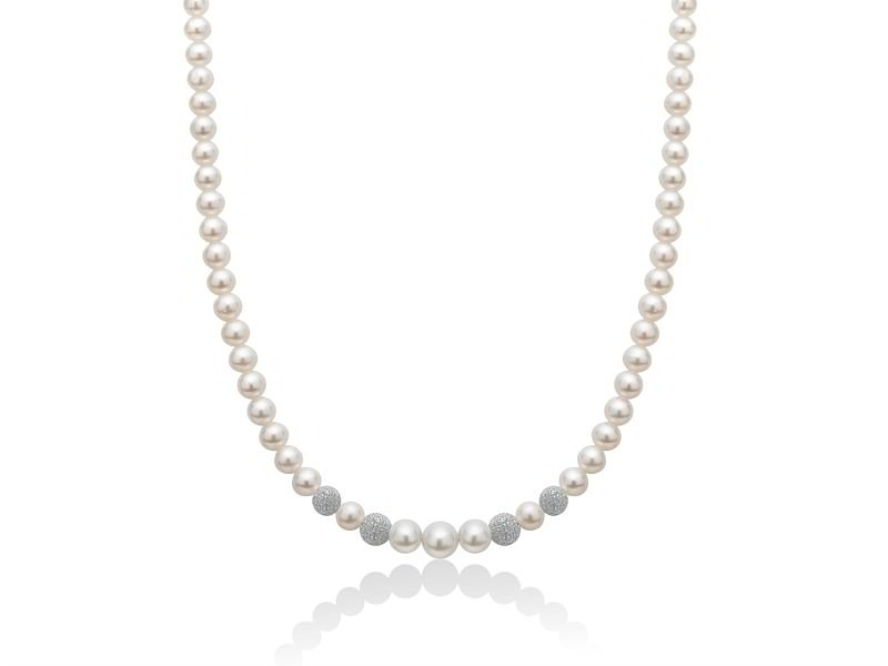 Collana Donna Miluna Perle Boule - PCL4377V Realizzata con una chiusura in oro 18kt e filo di perle bianche 5/5.5 mm, 2 perle di 6.5/7 mm e 1 perla di 7.5/8 mm e 3 perle diamantate. La lunghezza è di 43 cm circa