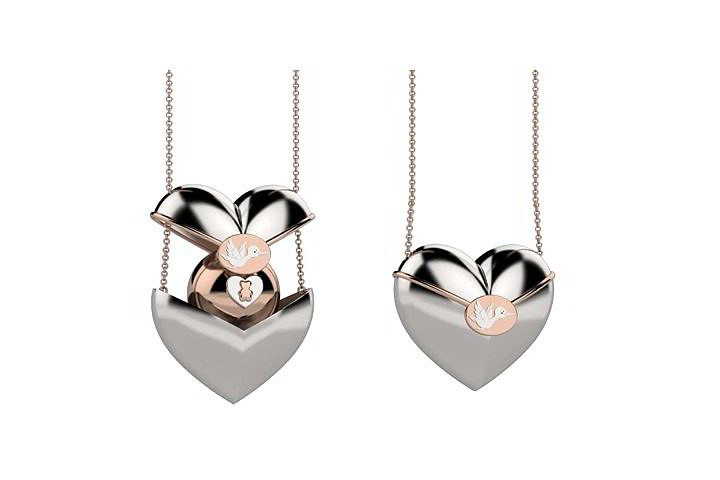 Collana pendente con cuoricino apribile in metallo rosa con cicogna rosa.