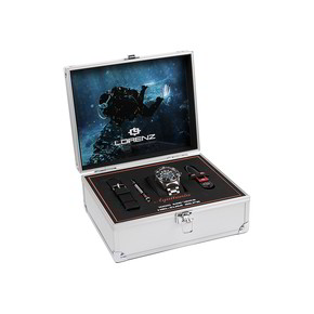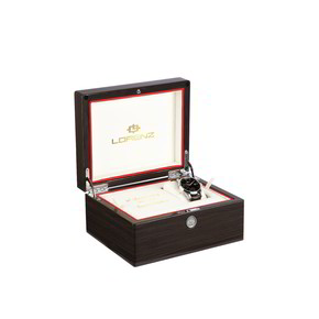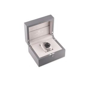 Realizzato con cassa rotonda in acciaio diametro 39 mm, fondello a vite e vetro zaffiro con lente.