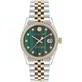 Con un movimento al quarzo solo tempo e vetro minerale che si adagia in una cassa d'acciaio di 34 mm con ghiera ricamata e meraviglioso dial effetto marmo verde, con datario ore 3 a lente ciclopica.