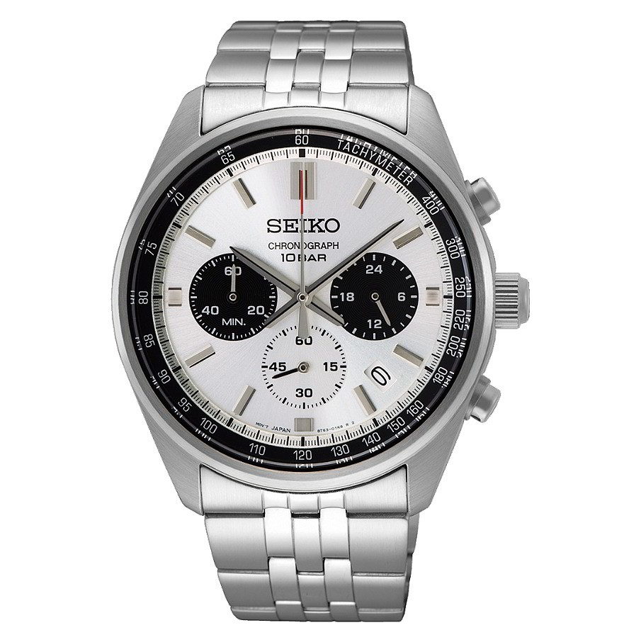 Lo stile non abbandona mai la storia di Seiko, che riporta in luce il design totale del suo cronografo in un magnifico dial di colore bianco con totalizzatori neri.