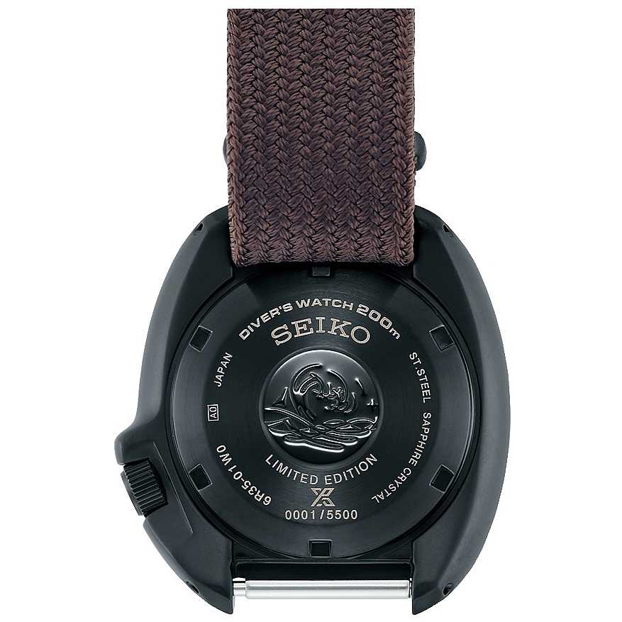 Il suo stile e le sue linee vanno a richiamare in tutto quegli anni ed infatti Seiko ha voluto mantenere quel design implementando però le nuove tecnologie e le migliorie del giorno d'oggi. In questa magnifica serie di colore nera denominata appunto Black Series, Seiko vuole dare continuità ad un orologio unico nel suo genere per bellezza e caratteristiche. Con il suo movimento 6R35 automatico con oltre 70 ore di riserva e opzione di carica manuale. Cassa iconica turtle in acciaio inossidabile di colore nero, di 42.7 mm, con ghiera in ceramica e indici e numeri bianchi e arancioni con effetto lumibrite. Un magnifico cinturino in nato viene accompagnato nella sua edizione speciale con un cinturino in silicone, nello speciale pacchetto. Il dial è nero e scocca le ore sotto un vetro zaffiro con rivestimento antiriflesso. Nell'edizione limitata 5500 pezzi al mondo con numero progressivo sul fondello. Un Prospex che si lega indissolubilmente al fascino dei fondali marini nella notte con una resistenza di 20 atm.