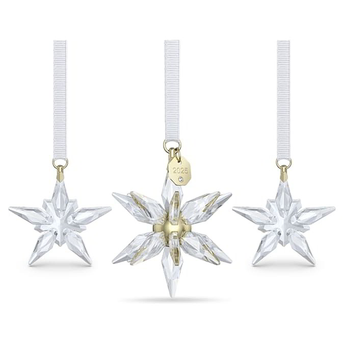 Questo Annual Edition Set Decorazioni 3D porterà una magia piena di luce a qualsiasi arredamento festivo. Il trio scintillante per il 2025 si ispira alla serenità del cielo notturno e presenta una Annual Edition Decorazione 3D e due Decorazioni Little Star. In totale, il set è realizzato con 773 sfaccettature di precisione, con ogni creazione sospesa a un nastro in gros-grain bianco con dettagli placcati in tonalità oro champagne, tra cui una targhetta con inciso “2025” sulla grande stella 3D. Dimensioni di 6.1 x 4.6 x 4.6 cm e 4.9 x 0.8 x 4.3 cm.