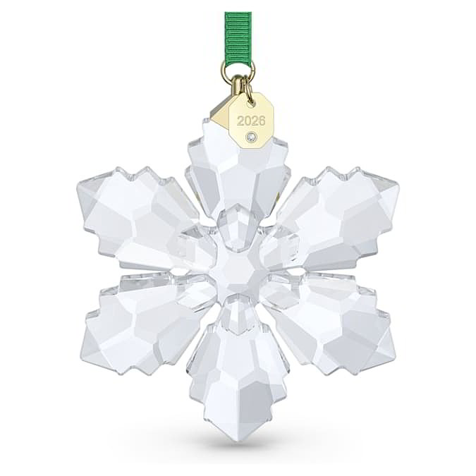 La nostra apprezzata tradizione di Decorazioni Annual Edition continua nel 2026 con la creazione a forma di fiocco di neve geometrico. Con il suo taglio magistrale a 192 sfaccettature, il design trasparente è sospeso su un nastro in gros-grain verde e presenta una targhetta in metallo placcato in tonalità oro, che reca inciso l’anno ed è impreziosita da un piccolo chaton. Dimensioni 6.6 x 1.3 x 8.4 cm.