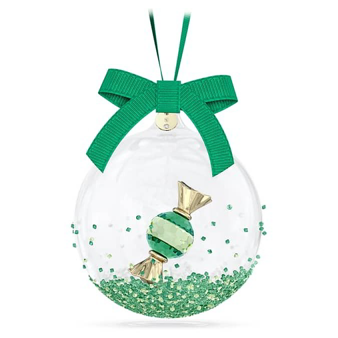 Questa deliziosa decorazione pallina, che sintetizza tutta la dolcezza e la gioia della stagione, presenta il tipico colore verde Swarovski e 230 luminose sfaccettature. Il meraviglioso design in vetro è impreziosito da circa 2.200 piccoli Crystal Rocks all’esterno, che creano l’impressione che la creazione sia stata immersa in zucchero colorato. All’interno, una caramella verde con un lussuoso involucro in metallo in tonalità oro è sospesa a mezz’aria. Dimensioni di 10 x 8 x 8 cm.