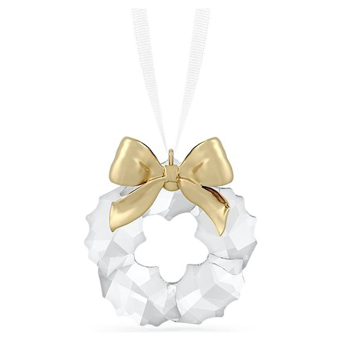 Questa lussuosa decorazione ghirlanda rappresenta un intramontabile simbolo di festosa eleganza. Sospeso a un nastro in gros-grain bianco, il design cristallizzato presenta 108 sfaccettature che riflettono la luce, insieme a un fiocco lucido in metallo in tonalità oro champagne. Dimensioni di 6.3 x 1.7 x 5.6 cm.