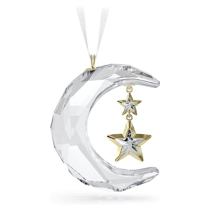 Traendo ispirazione da un cielo notturno stellato, questa maestosa decorazione conferirà un tocco celestiale a qualsiasi decorazione festiva. Lo scintillante design con 200 radiose sfaccettature, rappresenta una luna crescente con due stelle sospese, incastonate in una montatura in tonalità oro champagne. L’insieme è sospeso su un lussuoso nastro gros-grain bianco. Dimensioni di 4 x 1.9 x 3.9 cm.