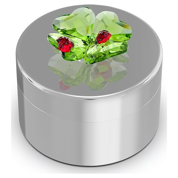 Ideale per riporre i tuoi tesori, questo portaoggetti in acciaio lucido è decorato con una giocosa raffigurazione di un quadrifoglio e una coccinella. Il motivo ispirato alla natura è realizzato con 206 sfaccettature e combina tonalità di verde e rosso che catturano magnificamente lo sguardo. All’interno, il portaoggetti include un astuccio in velluto, per custodire sempre al sicuro il suo contenuto. Dimensioni di 5.5 x 7 x 7 cm.