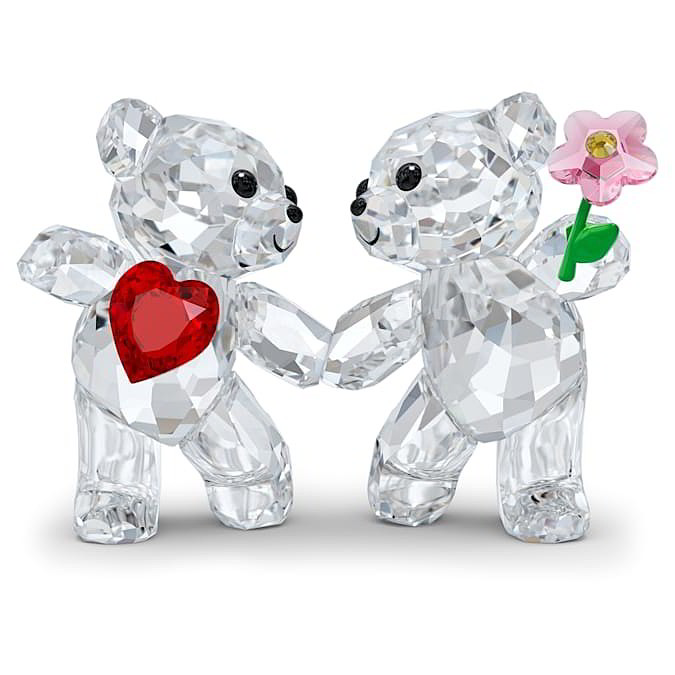 Impreziosita da 867 sfaccettature, questa elegante coppia di Orsetti Kris brilla meravigliosamente in Clear Crystal. Un orsetto stringe un cuore in cristallo rosso, l’altro regge un fiore in cristallo rosa con uno stelo e una foglia in metallo laccato verde. Dimensioni di 4.1 x 5.7 x 3.3 cm.