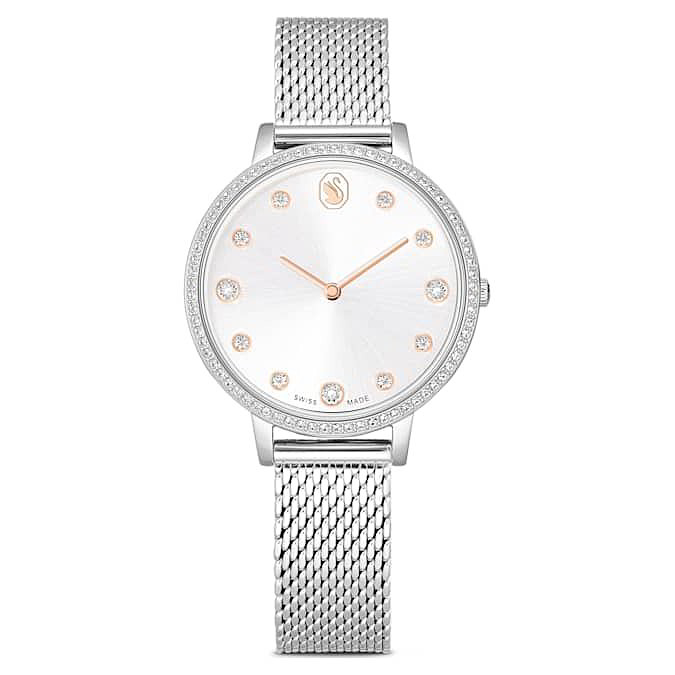 Con cassa da 35 mm in acciaio e cinturino anch'esso in acciaio, è tutto impreziosito da Clear Crystal.