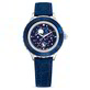 Una una cassa in acciaio di 37 mm e cinturino in pelle di colore blu