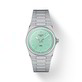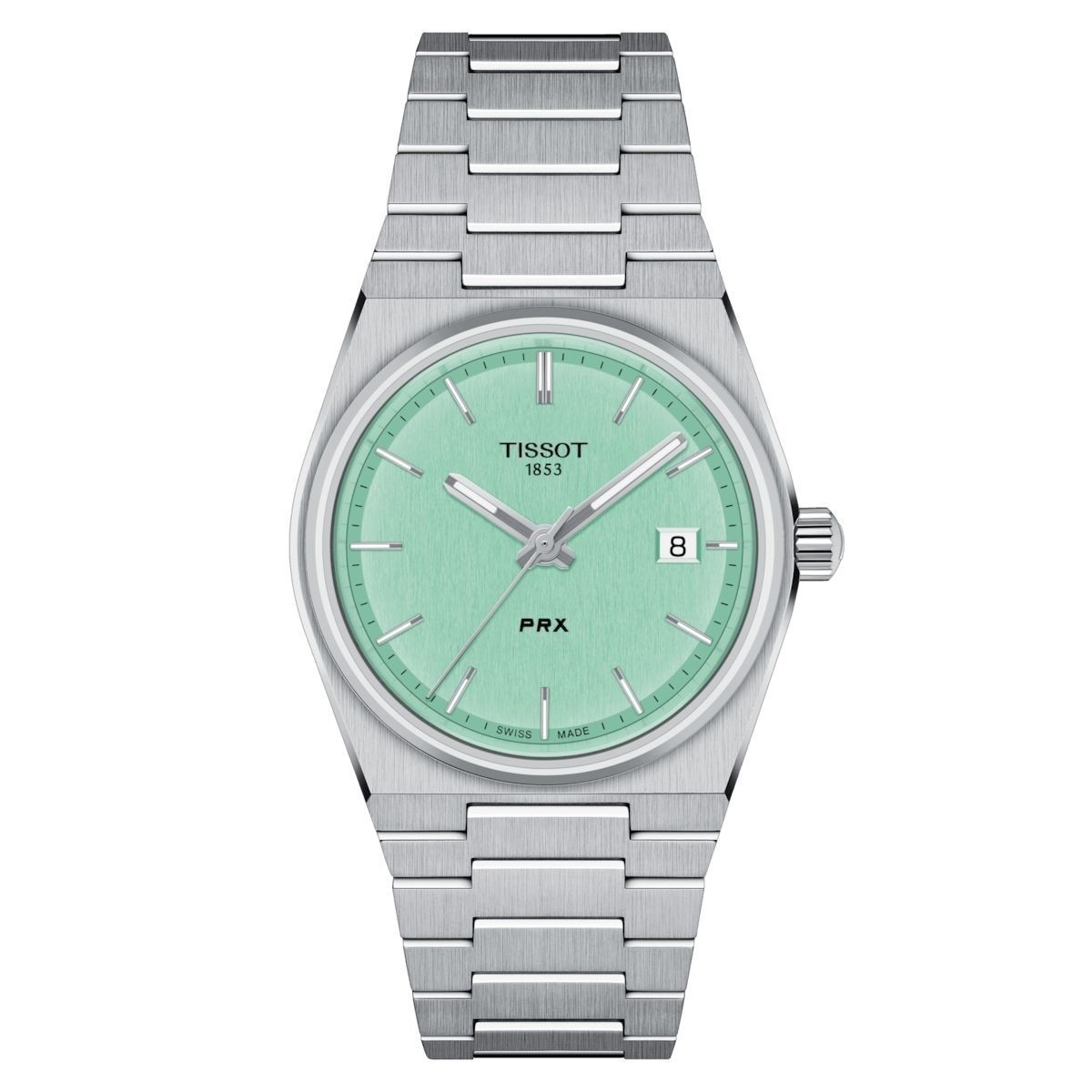 Tissot creò un modello al quarzo, caratterizzato da una cassa sottile, indici stretti e un bracciale in acciaio. La sua ampia ansa orizzontale, tipica dell'epoca, era perfettamente integrata nella cassa piatta a forma di tonneau. Pochi anni dopo, Tissot ha registrato il nome PRX. "PR" sta per "preciso" e "robusto". La "X" sta per il numero romano dieci e per la pressione di 10 bar che l'orologio è in grado di sopportare. Il Tissot PRX 40205 Quartz è dotato di un quadrante con un motivo a raggiera di colore ice blue in combinazione con indici e lancette silver.