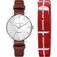 Orologio Donna Trussardi T-Evolution - R2451120505 Con movimento al quarzo, solo tempo. La cassa rotonda è in acciaio del diametro di 40 mm con silver. Il quadrante è sviler. Il cinturino è in pelle marrone con secondo cinturino in nylon rosso. La resistenza all'acqua è di 3 atm.