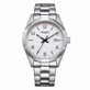 Una cassa di 39 mm in acciaio con cinturino in acciaio e dial di colore bianco.